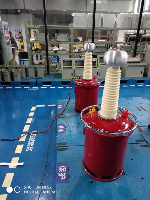 外部電源接入控制臺(tái)(箱),控制臺(tái)(箱)設(shè)有過流自動(dòng)脫扣,以及防止突發(fā)加壓的零位連鎖裝置,經(jīng)自耦調(diào)壓器調(diào)節(jié)電壓后輸入變壓器初級(jí)繞組。根據(jù)電磁感應(yīng)原理,在變壓器次級(jí)(高壓)繞組按其與初級(jí)繞組匝數(shù)之比,可獲得同等倍數(shù)的電壓幅值-----工頻高壓;此工頻高壓如果經(jīng)高壓硅堆整流及穩(wěn)壓電容器濾波可取得直流高壓,其幅值是工頻高壓有效值的1.4倍。